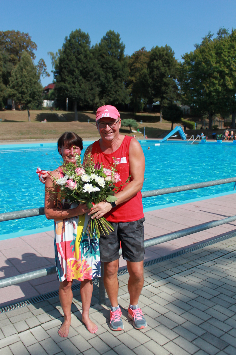 Brita Helsinger aus Nobitz war überrascht, als der Ewa-Bäder-Chef Oliver Heber, sie am Sonnabendvormittag als 40.000sten Gast des Freibades in dieser Saison begrüßte. Fast täglich zieht sie ihre Bahnen im Altenburger „Südbad“. Auf die Frage, was sie am Bad besonders mag, antwortete sie spontan: „Das familiäre Verhältnis zum Personal und die vielen Freundschaften, die hier bei unzähligen Besuchen entstanden sind.“ Neben einem Blumenstrauß überreichte Oliver Heber ihr auch eine Zehnerkarte für das Altenburger Hallenbad in der Hoffnung, dass sie unseren Bädern auch in der kühleren Jahreszeit treu bleibt.