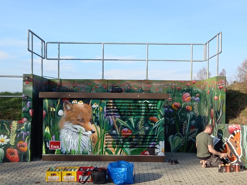 Unsere Vorgabe für Farbe und Gestaltung war ein naher Bezug zu Flora und Fauna der Region. Mit Ralf Hecht von HechtArt haben wir für die Umsetzung unseres Projektes einen Graffitikünstler beauftragt, der als Altenburger die Region kennt und mit Freude und Ideenreichtum an der Umsetzung unserer Vorstellung gearbeitet hat.